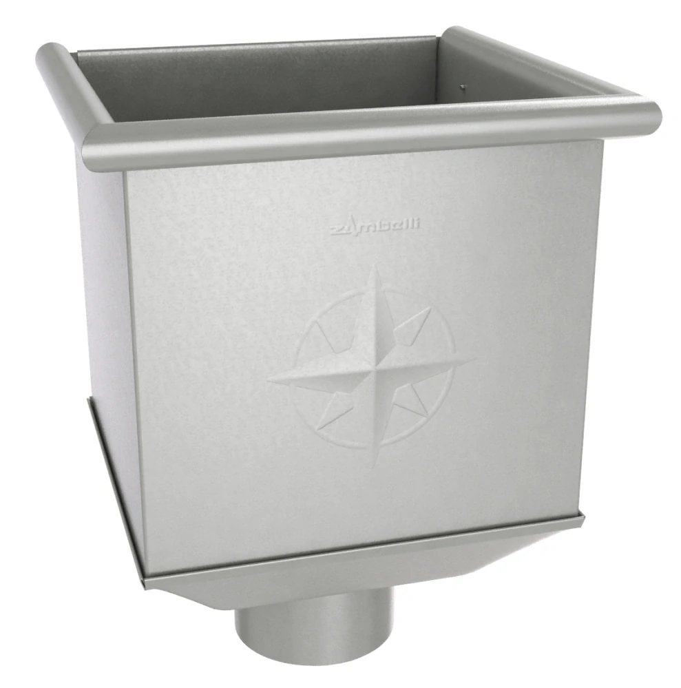 Kotlík kvadratický od Zambelli je určený predovšetkým na odvodnenie plochých striech, kde je zvodová rúra umiestnená na vonkajšej strane fasády. Kotlík sa montuje priamo na fasádu a vyžaduje pripravený otvor pre vpusť zo strechy.